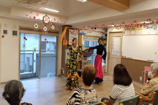 開所して4年目の施設さんでした。入居者さんもお元気な方ばかりで 手拍子や声掛けもしていただき、私共も楽しく踊る事が出来ました。 |